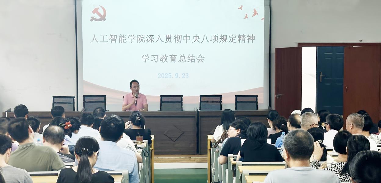 为持续深化作风建设,巩固拓展学习教育成果,9月23日下午,人工智能学院党委在先骕楼4-1120报告厅召开深入贯彻中央八项规定精神学习教育总结会,传达学习习近平总书记重要指示精神和中央党的建设工作领导小组会议精神、省委常委会会议精神,全面总结学院深入贯彻中央八项规定精神学习教育开展情况,研究部署巩固拓展学习教育成果、锲而不舍落实中央八项规定精神、推进作风建设常态化长效化工作。会议由党委书记胡弢主持,全体教师党员和学生党员代表参会。