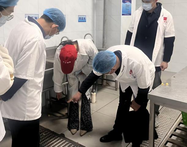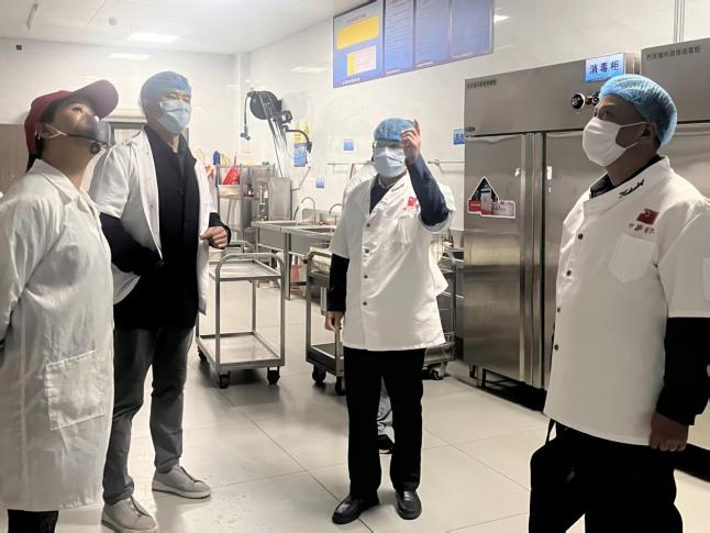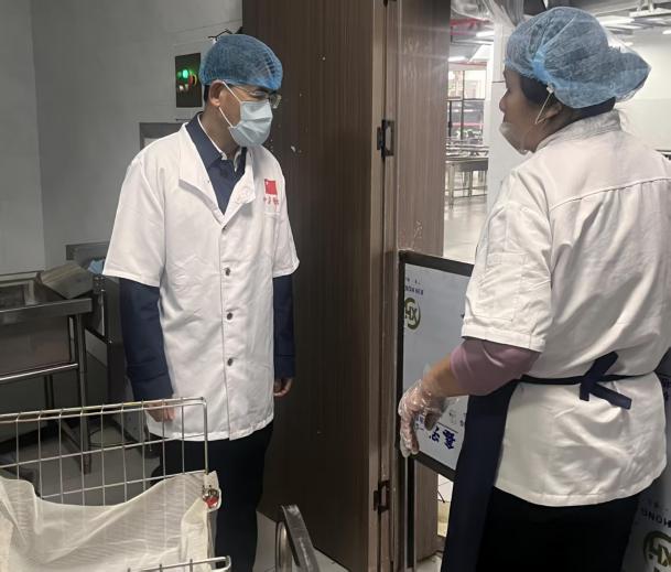 刘利民深入食堂后厨、仓库、操作间、传菜窗口和办公室,全面检查原材料储存、加工规范、样品留存、环境卫生及进货台账等情况。