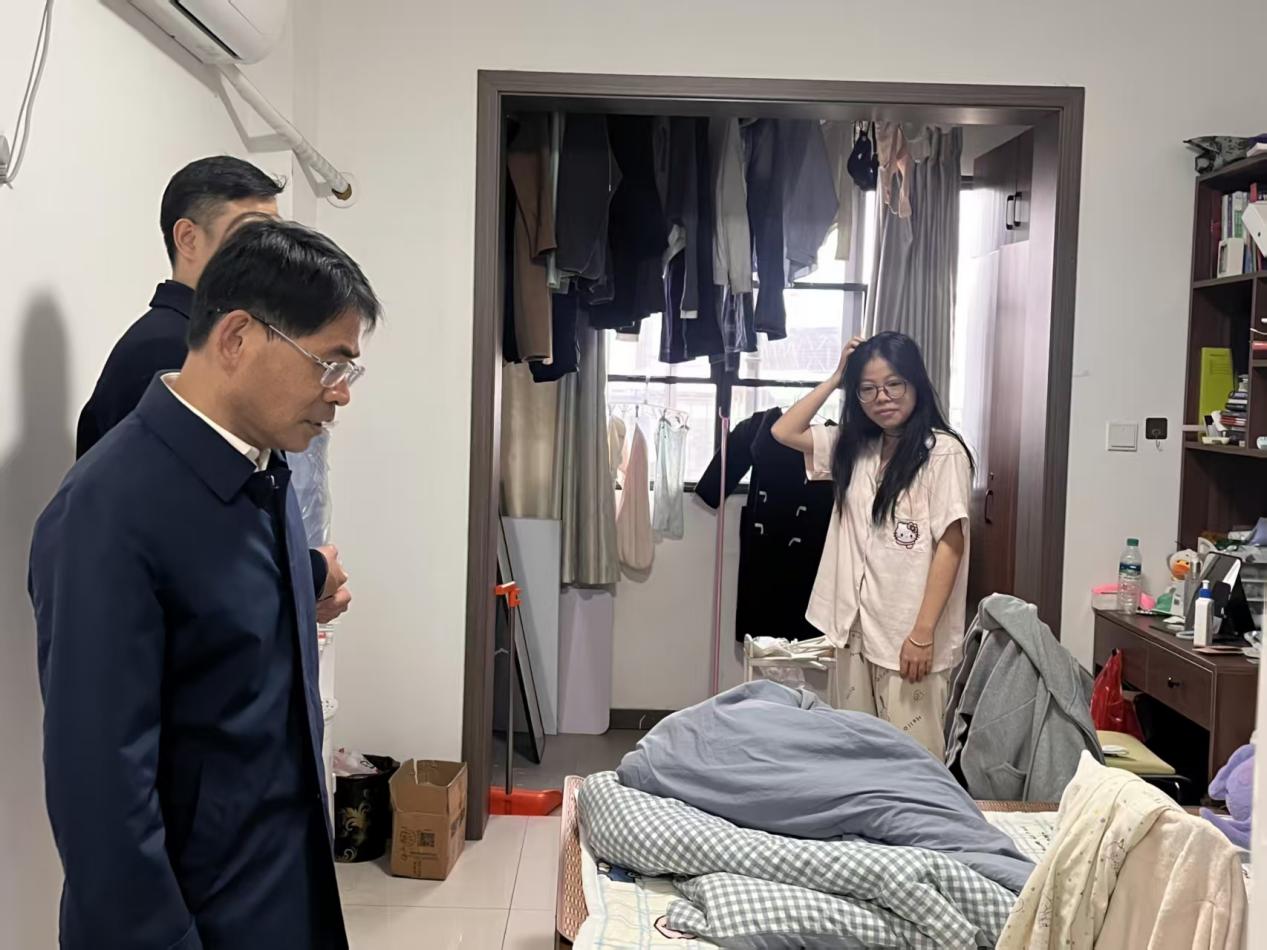 刘利民来到学生宿舍,察看住宿环境、消防设施,了解用电安全管理,倾听学生对日常起居、就餐购物等方面的需求与建议。
